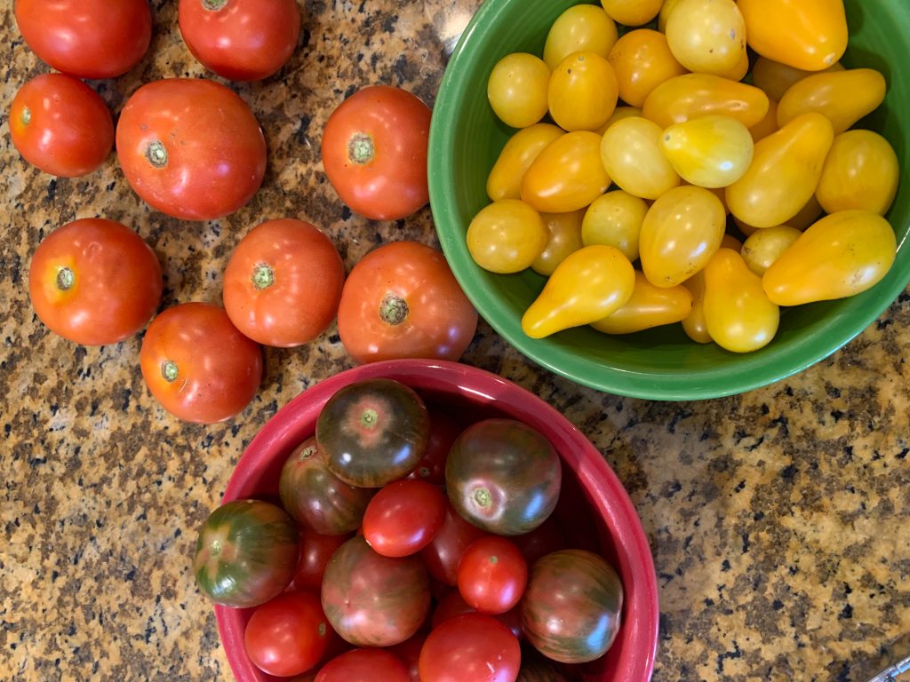 At first, we just made sauce, and that was either bottled or frozen. But the tomatoes kept coming. Today we had a storm forecast, lots of wind and rain, so yesterday I picked as many tomatoes as I could. At the end of the day, there were over 20 pounds of fruit in our trays.