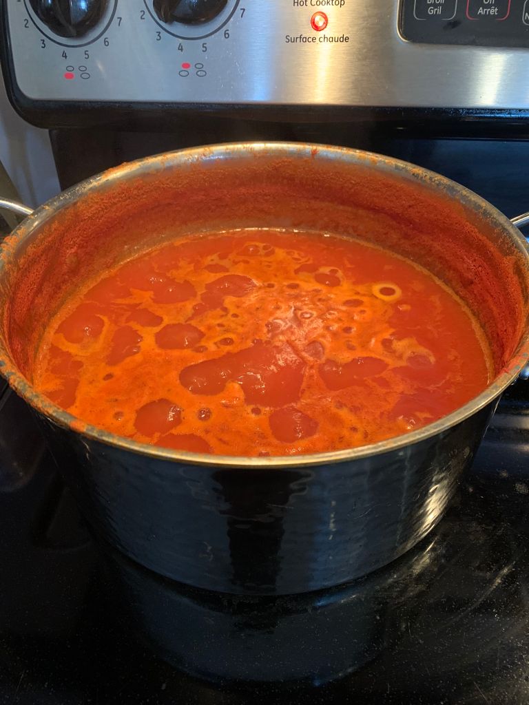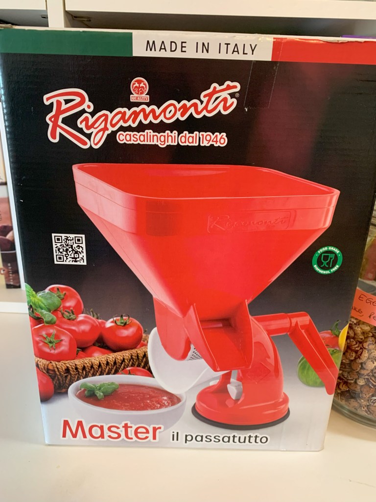 We had pretty close to a perfect summer this year, if you are a tomato; some rain early on and then long stretches of sunshine and low humidity. Inundated with tomatoes, we processed them through our dandy Italian tomato press to get rid of the skins and seeds. This isn’t a paid advertisement or a product placement or anything, but if you’re serious about making tomato sauce and the like, get yourself one of these or something similar. It’s so much easier than doing the ‘blanche in boiling water then dip in an ice bath before removing the skins’ thing.