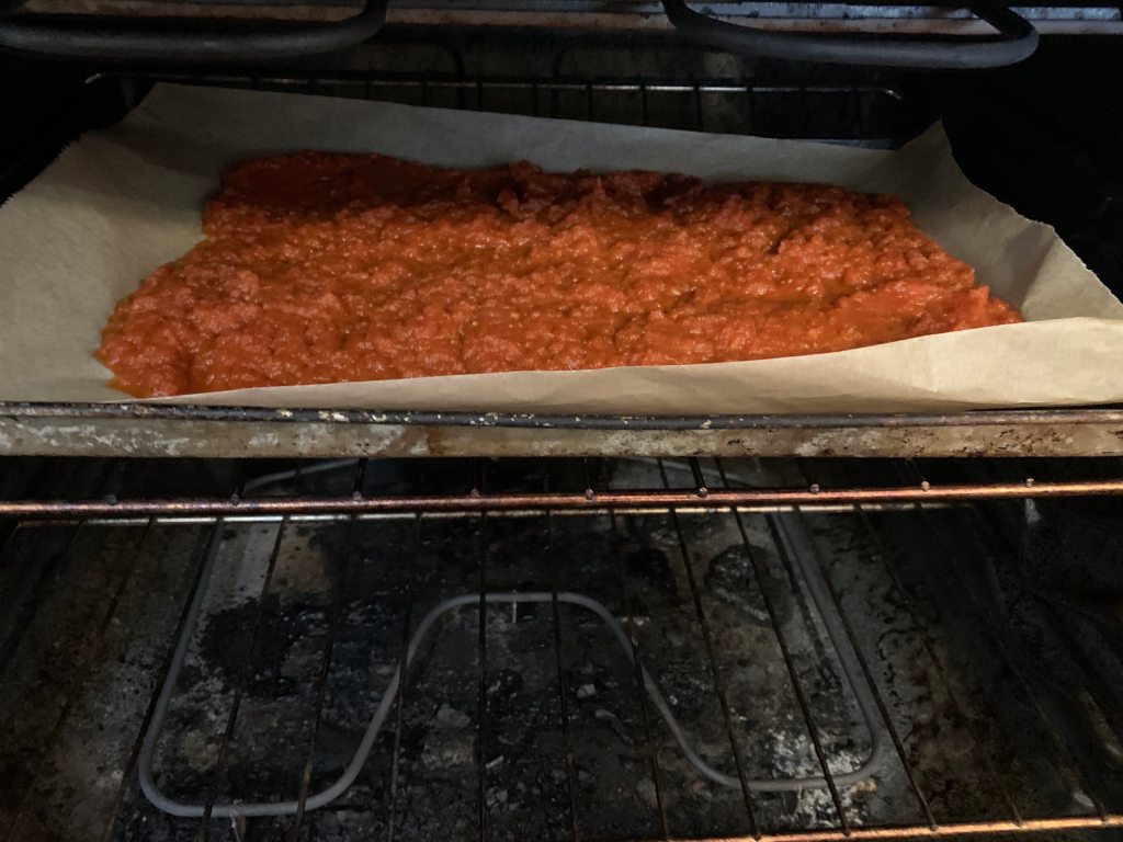 I had some lunch and watched the football (soccer). It’s an international break from the club games, something called the League of Nations, and England beat the Republic of Ireland 2-0. Victoria came for lunch and beat me at Scrabble. No surprise at either of those results. People from the cruise ships put on silly clear plastic ponchos and rode up and down Queen Street in the back of a horse-drawn wagon. Just a normal quiet and rainy Saturday on the Island. Every so often I got up and stirred the pot until it had reduced to about a litre of thick mush. I spread this on a baking sheet and put it in the oven for half an hour, to bake at a low temperature.