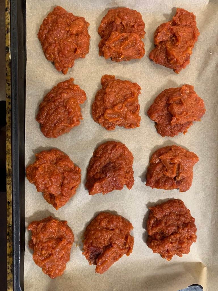 Tomorrow, I’ll collect my dollops into a couple of freezer bags, for storage. Whenever we have a need for tomato paste during the winter, we’ll pull out a dollop and defrost it.